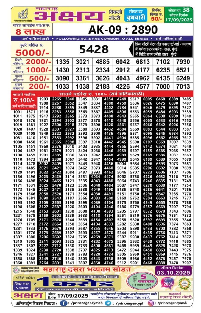 Maharashtra Lottery Result Today 4.15 PM (17-09-2025)