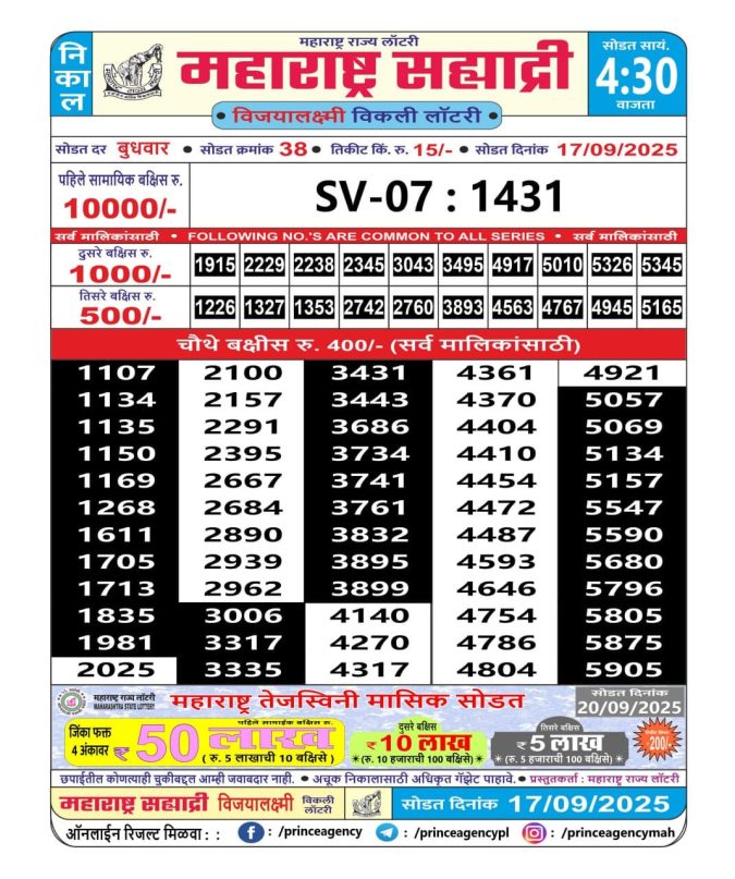 Maharashtra Sahyadri Lottery Result Today 4.30 PM (17-09-2025)