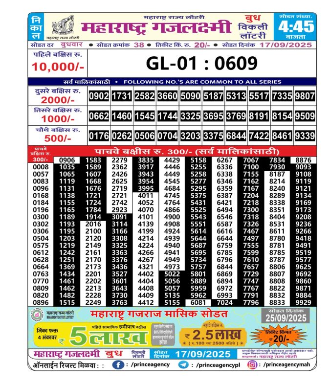 Maharashtra Gajlaxmi Lottery Result Today 4.45 PM (17-09-2025)