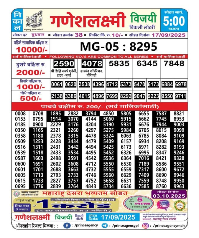 Maharashtra Ganeshlaxmi Lottery Result Today 5 PM (17-09-2025)