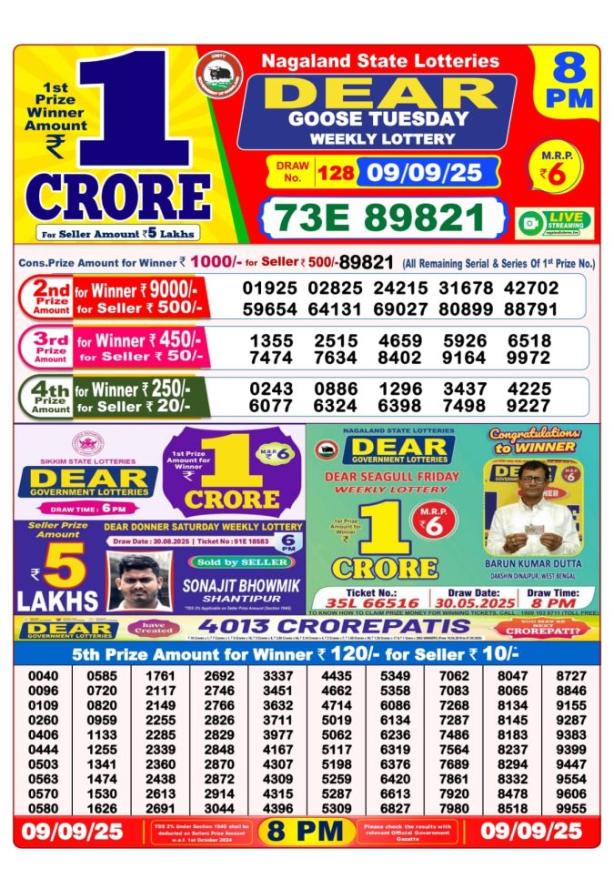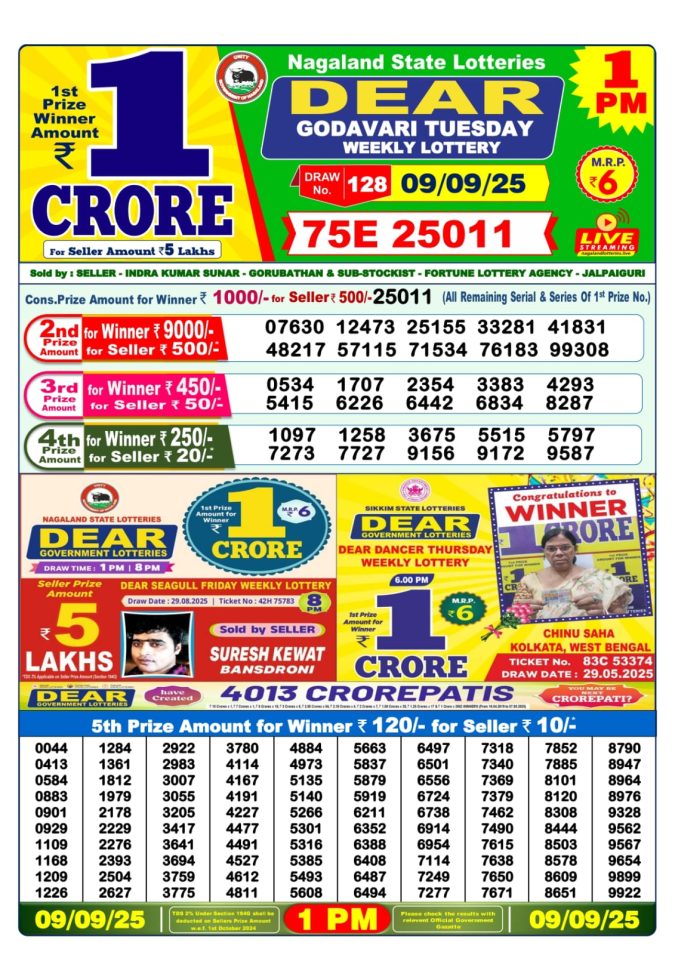 Nagaland Dear Lottery Result Today 1 PM (09-09-2025)