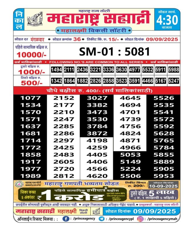 Maharashtra Sahyadri Lottery Result Today 4.30 PM (09-09-2025)