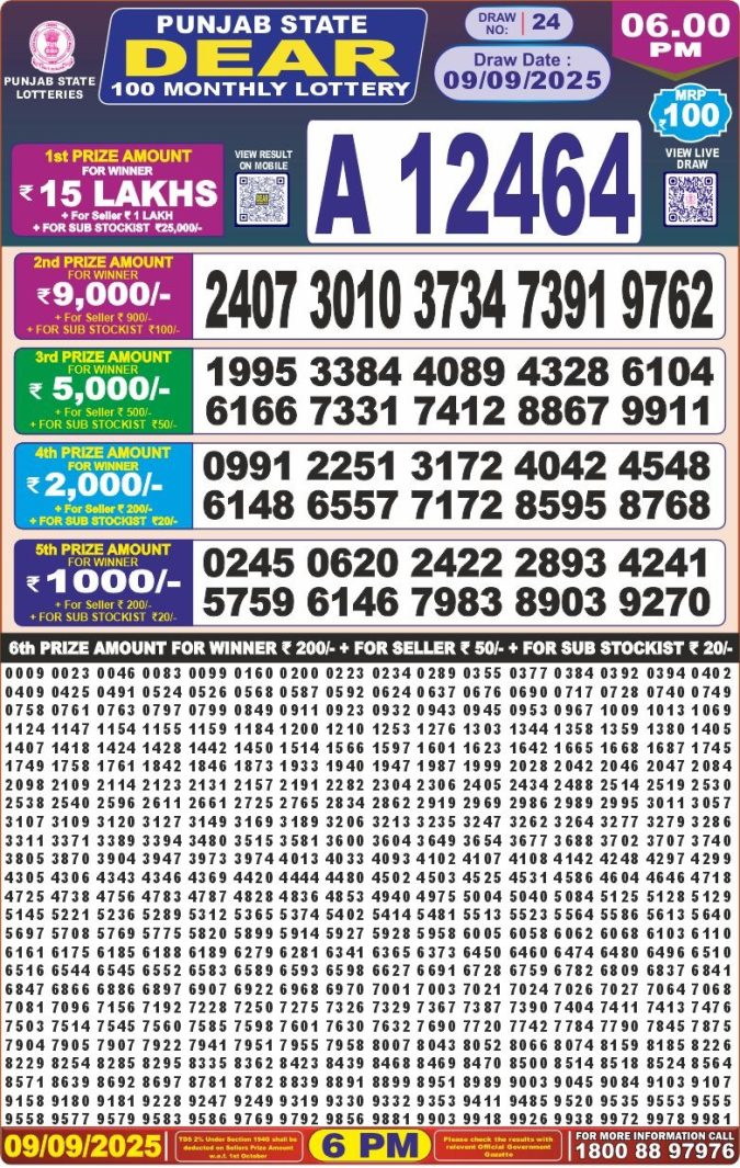 Punjab State Dear 100 Monthly Lottery Result Today 6PM (09-09-2025)