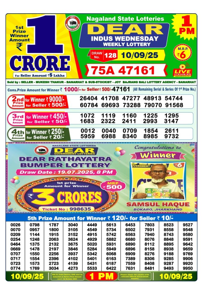 Nagaland Dear Lottery Result Today 1 PM (10-09-2025)