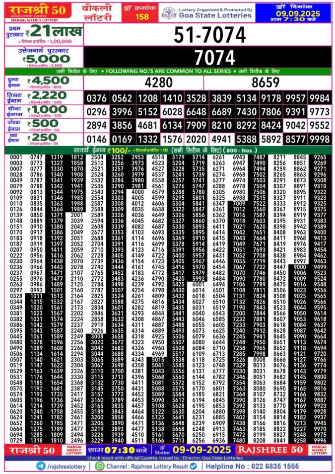 Goa Rajshree 50 Lottery Result Today 7:30 PM (09-09-2025)
