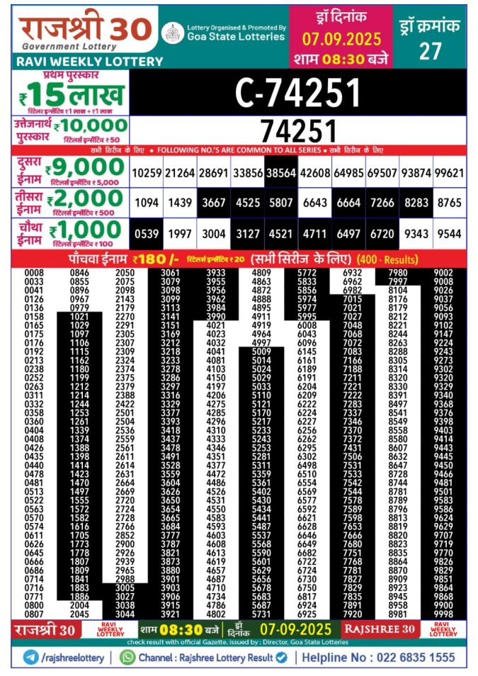 Goa Rajshree 30 Lottery Result Today 8:30 PM (07-09-2025)