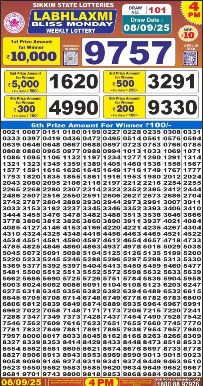 Sikkim Labh Laxmi Lottery Result Today 4 PM (08-09-2025)