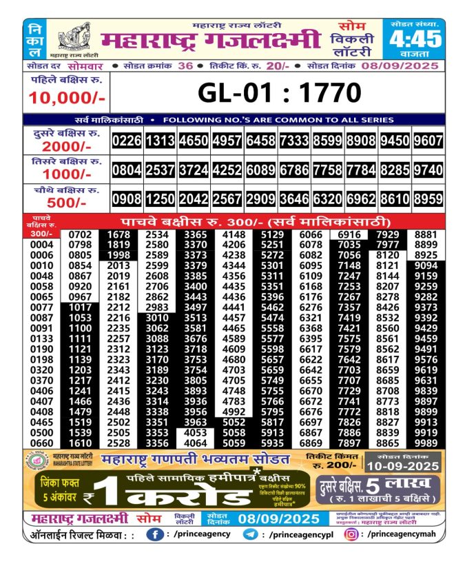 Maharashtra Gajlaxmi Lottery Result Today 4.45 PM (08-09-2025)