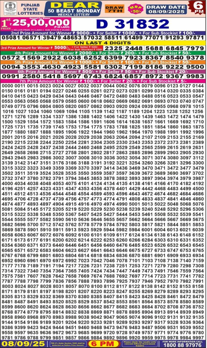 Punjab State Dear 50 Lottery Result Today 6 PM (08-09-2025)