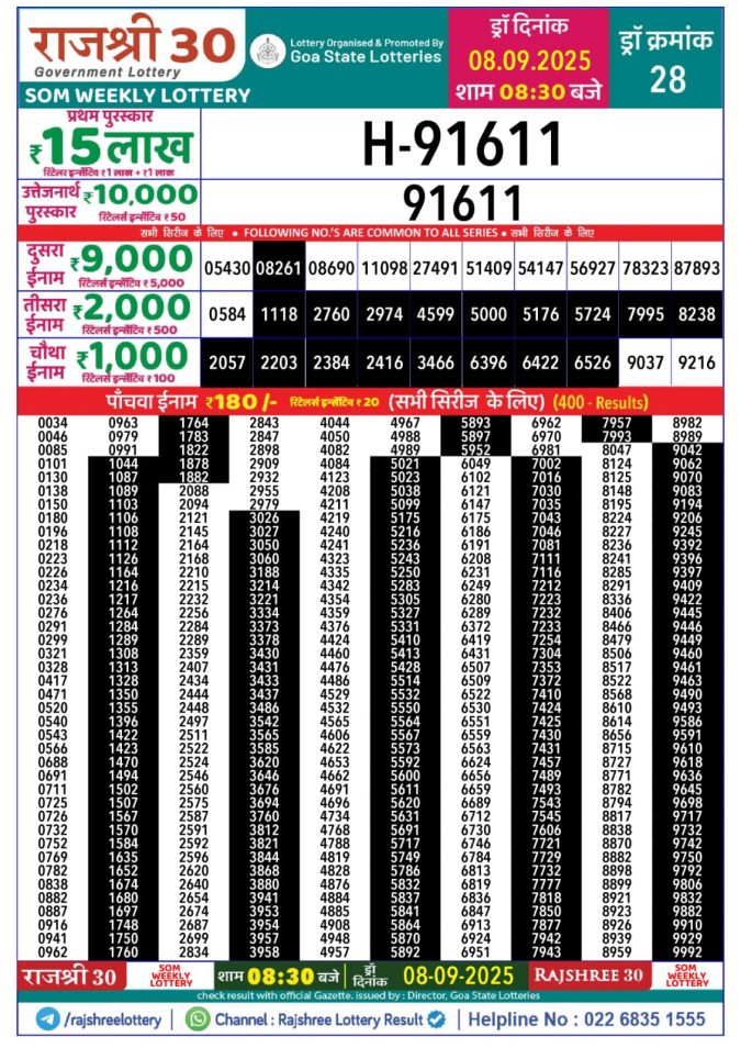Goa Rajshree 30 Lottery Result Today 8:30 PM (08-09-2025)