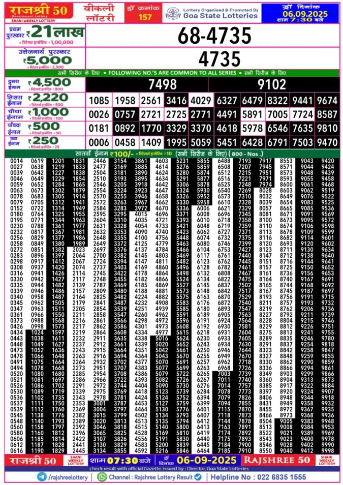 Goa Rajshree 50 Lottery Result Today 7:30 PM (06-09-2025)