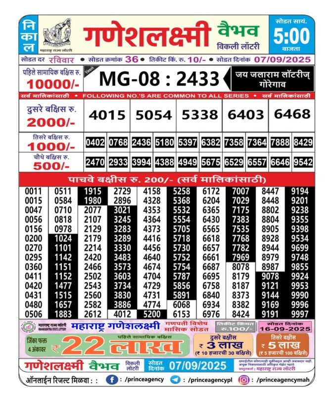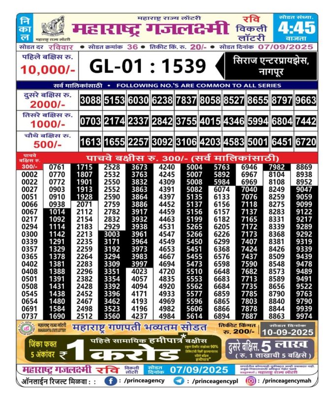 Maharashtra Ganeshlaxmi Lottery Result Today 5 PM (07-09-2025)