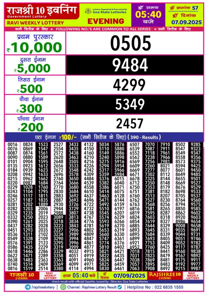 Goa Rajshree 10 Evening Lottery Result Today 5:40 PM (07-09-2025)