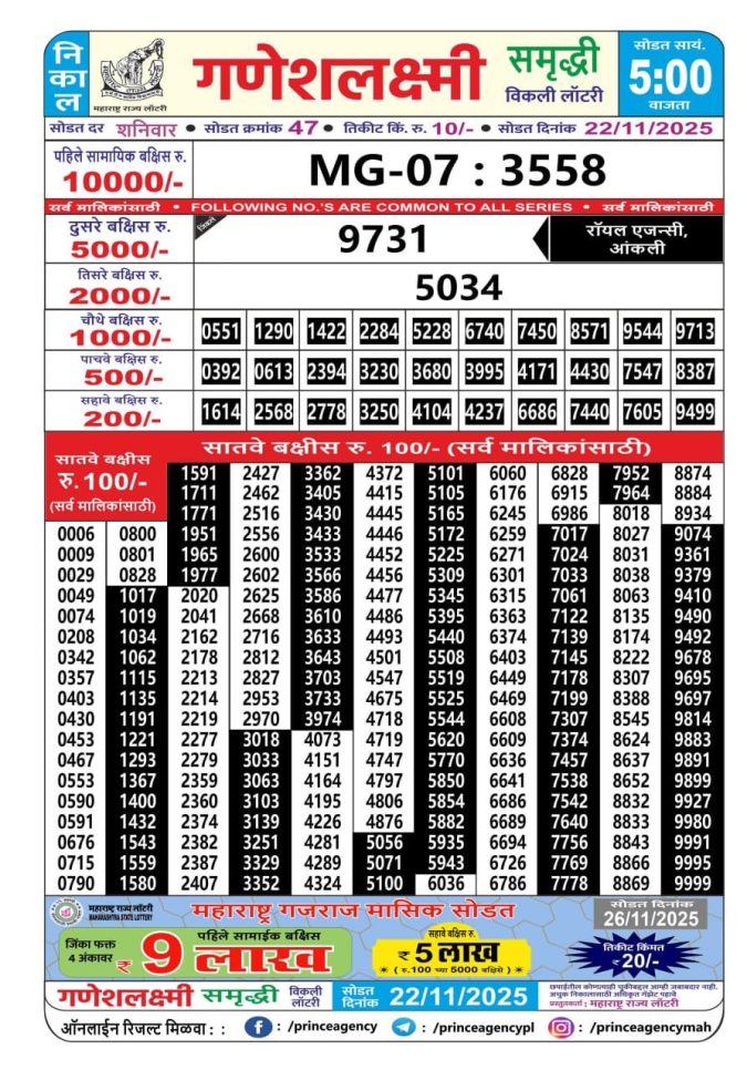 Maharashtra Ganeshlaxmi Lottery Result Today 5PM [22-11-2025]
