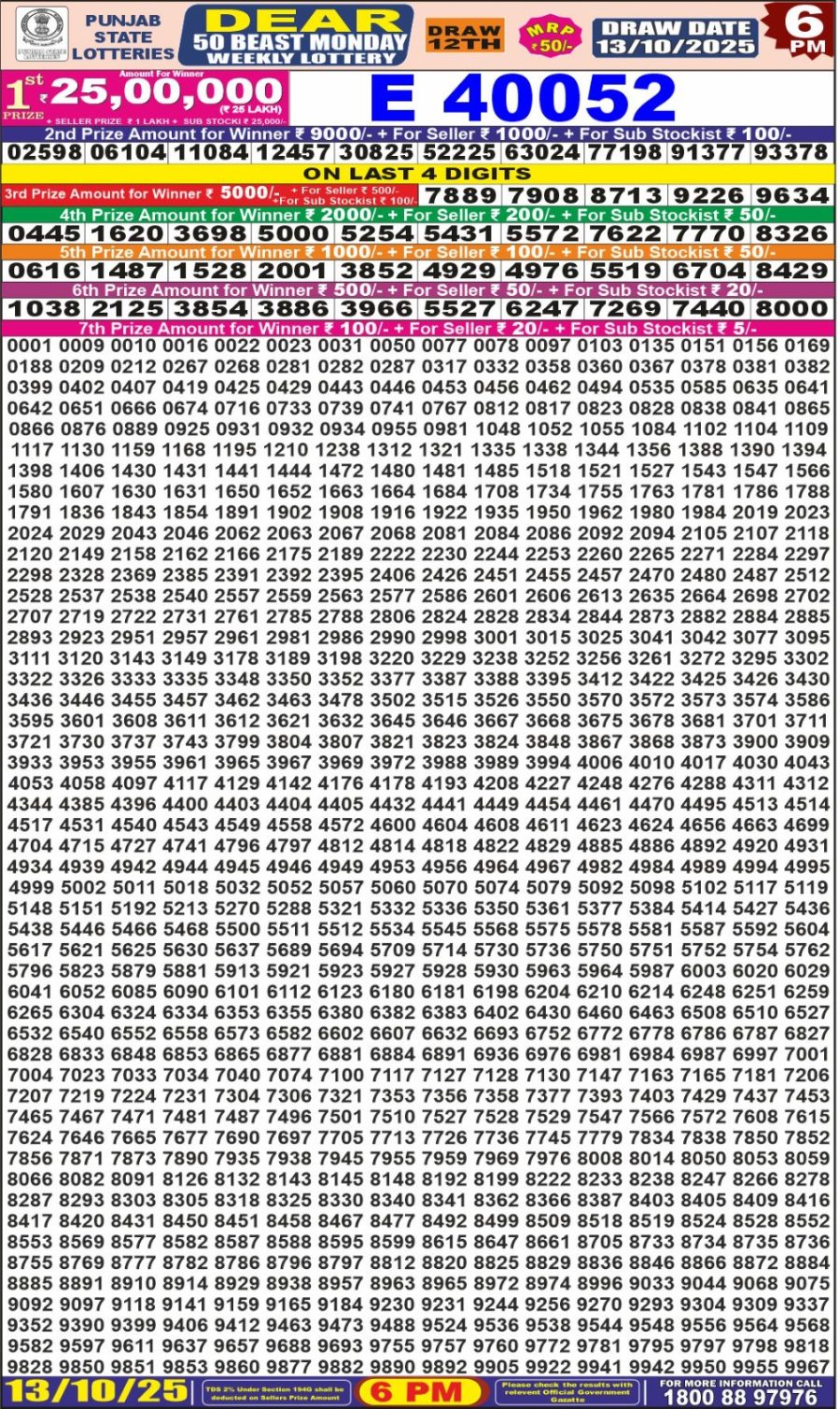 Punjab State Dear 50 Lottery Result Today 6 PM (13-10-2025) Leave a Comment on Punjab State Dear 50 Lottery Result Today 6 PM (13-10-2025) Posted in Lottery Sambad Results Share: TwitterFacebookPinterestRedditVKDiggLinkedinMix Related Results 0 34 Nagaland Dear Lottery Result Today 1 PM (14-08-2025) Nagaland Dear Lottery Result Today 1 PM (14-08-2025) Nagaland Dear Lottery Result Today 1 PM (14-08-2025) Nagaland Dear Lottery Result Today 1 PM (14-08-2025) Nagaland Dear Lottery Result Today 1 PM (14-08-2025) 0 41 Punjab State Dear 20 Lottery Result Today 6 PM (26-08-2025) Punjab State Dear 20 Lottery Result Today 6 PM (26-08-2025) Punjab State Dear 20 Lottery Result Today 6 PM (26-08-2025) Punjab State Dear 20 Lottery Result Today 6 PM (26-08-2025) Punjab State Dear 20 Lottery Result Today 6 PM (26-08-2025) 0 89 Sikkim State LabhLaxmi Lottery Result Today 4 PM Declared 28-05-2025 Sikkim State LabhLaxmi Lottery Result Today 4 PM Declared 28-05-2025 Sikkim State LabhLaxmi Lottery Result Today 4 PM Declared 28-05-2025 Sikkim State LabhLaxmi Lottery Result Today 4 PM Declared 28-05-2025 Sikkim State LabhLaxmi Lottery Result Today 4 PM Declared 28-05-2025 0 80 Golden Star Lottery Result Today 9 PM 12-06-2025 Golden Star Lottery Result Today 9 PM 12-06-2025 Golden Star Lottery Result Today 9 PM 12-06-2025 Golden Star Lottery Result Today 9 PM 12-06-2025 Golden Star Lottery Result Today 9 PM 12-06-2025