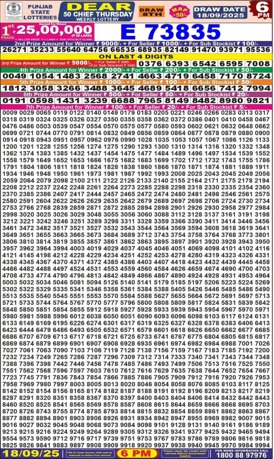 Punjab State Dear 50 Lottery Result Today 6 PM (18-09-2025) Leave a Comment on Punjab State Dear 50 Lottery Result Today 6 PM (18-09-2025) Posted in Lottery Sambad Results Share: TwitterFacebookPinterestRedditVKDiggLinkedinMix Related Results 0 73 Nagaland State Dear 100 Lottery Result Today 5 PM 22-05-2025 Nagaland State Dear 100 Lottery Result Today 5 PM 22-05-2025 Nagaland State Dear 100 Lottery Result Today 5 PM 22-05-2025 Nagaland State Dear 100 Lottery Result Today 5 PM 22-05-2025 Nagaland State Dear 100 Lottery Result Today 5 PM 22-05-2025 0 59 Nagaland Dear Lottery Result Today 8 PM (07-07-2025) Nagaland Dear Lottery Result Today 8 PM (07-07-2025) Nagaland Dear Lottery Result Today 8 PM (07-07-2025) Nagaland Dear Lottery Result Today 8 PM (07-07-2025) Nagaland Dear Lottery Result Today 8 PM (07-07-2025) 0 80 Goa State Rajshree 30 Lottery Result Today 8.30 PM 21-05-2025 Goa State Rajshree 30 Lottery Result Today 8.30 PM 21-05-2025 Goa State Rajshree 30 Lottery Result Today 8.30 PM 21-05-2025 Goa State Rajshree 30 Lottery Result Today 8.30 PM 21-05-2025 Goa State Rajshree 30 Lottery Result Today 8.30 PM 21-05-2025 0 9 Maharashtra Gajlaxmi Lottery Result Today 4.45 PM (09-10-2025) Maharashtra Gajlaxmi Lottery Result Today 4.45 PM (09-10-2025) Maharashtra Gajlaxmi Lottery Result Today 4.45 PM (09-10-2025) Maharashtra Gajlaxmi Lottery Result Today 4.45 PM (09-10-2025) Maharashtra Gajlaxmi Lottery Result Today 4.45 PM (09-10-2025)