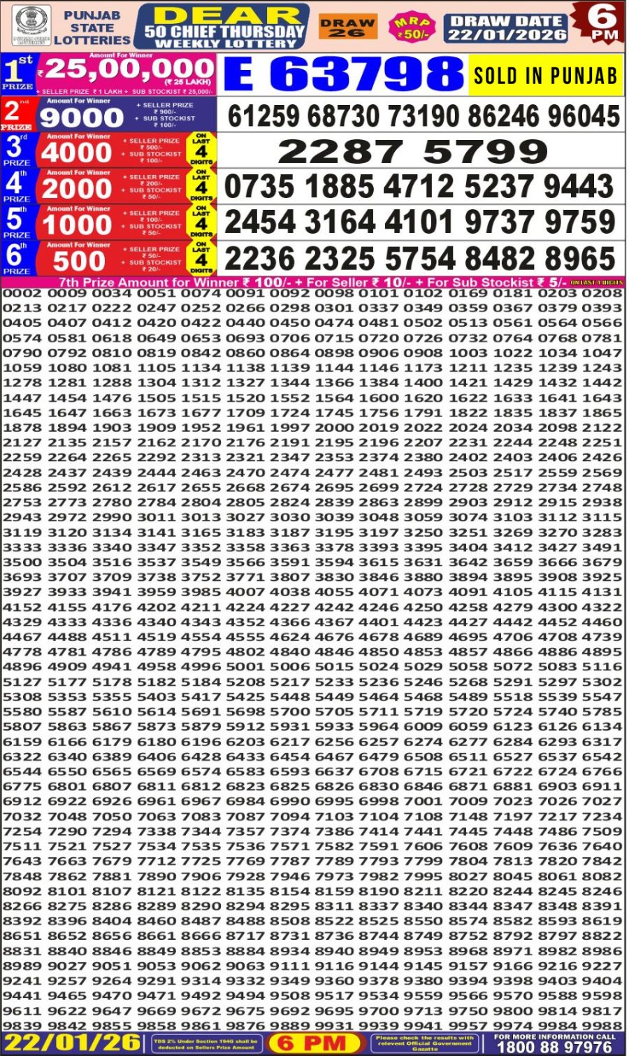 Punjab State Dear 50 Lottery Result Today 6PM [22-01-2026] Leave a Comment on Punjab State Dear 50 Lottery Result Today 6PM [22-01-2026] Posted in Lottery Sambad Results Share: TwitterFacebookPinterestRedditVKDiggLinkedinMix Related Results 0 132 Nagaland State Dear Lottery Result Today 8 PM 8-05-2025 Nagaland State Dear Lottery Result Today 8 PM 8-05-2025 Nagaland State Dear Lottery Result Today 8 PM 8-05-2025 Nagaland State Dear Lottery Result Today 8 PM 8-05-2025 Nagaland State Dear Lottery Result Today 8 PM 8-05-2025 0 50 Mizoram Rajshree Lottery Result Today 4PM [13-12-2025] Mizoram Rajshree Lottery Result Today 4PM [13-12-2025] Mizoram Rajshree Lottery Result Today 4PM [13-12-2025] Mizoram Rajshree Lottery Result Today 4PM [13-12-2025] Mizoram Rajshree Lottery Result Today 4PM [13-12-2025] 0 107 Arunachal State Dear 10 Lottery Result Today 1.30 PM 20-06-2025 Arunachal State Dear 10 Lottery Result Today 1.30 PM 20-06-2025 Arunachal State Dear 10 Lottery Result Today 1.30 PM 20-06-2025 Arunachal State Dear 10 Lottery Result Today 1.30 PM 20-06-2025 Arunachal State Dear 10 Lottery Result Today 1.30 PM 20-06-2025 0 47 Maharashtra Ganeshlaxmi Lottery Result Today 5 PM (30-10-2025) Maharashtra Ganeshlaxmi Lottery Result Today 5 PM (30-10-2025) Maharashtra Ganeshlaxmi Lottery Result Today 5 PM (30-10-2025) Maharashtra Ganeshlaxmi Lottery Result Today 5 PM (30-10-2025) Maharashtra Ganeshlaxmi Lottery Result Today 5 PM (30-10-2025)