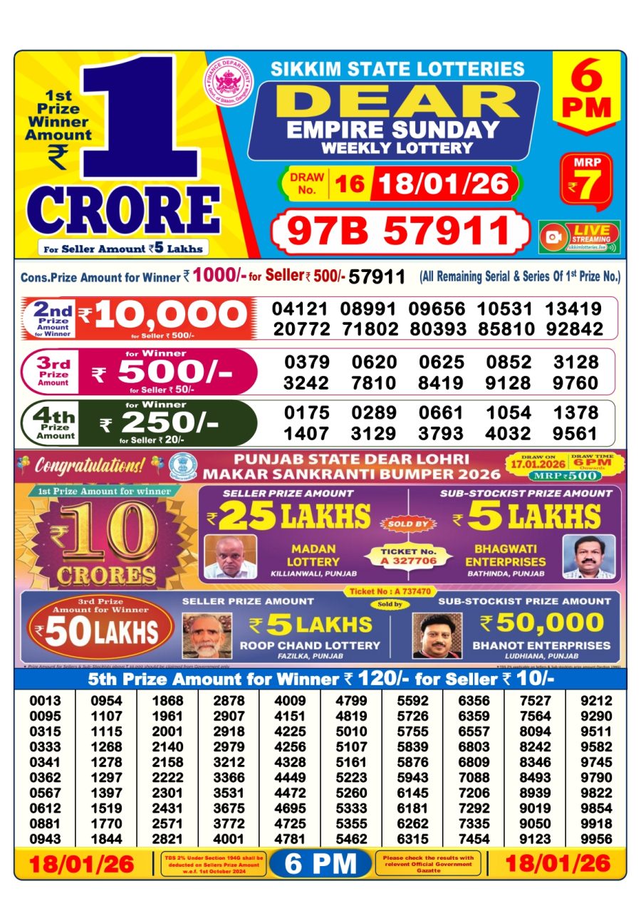 Sikkim State Dear Lottery 6PM ResulS [18-01-2026] Leave a Comment on Sikkim State Dear Lottery 6PM ResulS [18-01-2026] Posted in Lottery Sambad Results Share: TwitterFacebookPinterestRedditVKDiggLinkedinMix Related Results 0 119 Nagaland State Super Lottery Result Today 7 PM 18-05-2025 Nagaland State Super Lottery Result Today 7 PM 18-05-2025 Nagaland State Super Lottery Result Today 7 PM 18-05-2025 Nagaland State Super Lottery Result Today 7 PM 18-05-2025 Nagaland State Super Lottery Result Today 7 PM 18-05-2025 0 96 Maharashtra Lottery Result Today 4.15 PM (08-07-2025) Maharashtra Lottery Result Today 4.15 PM (08-07-2025) Maharashtra Lottery Result Today 4.15 PM (08-07-2025) Maharashtra Lottery Result Today 4.15 PM (08-07-2025) Maharashtra Lottery Result Today 4.15 PM (08-07-2025) 0 103 Mizoram State Rajshree Lottery Result Today 8 PM 11-06-2025 Mizoram State Rajshree Lottery Result Today 8 PM 11-06-2025 Mizoram State Rajshree Lottery Result Today 8 PM 11-06-2025 Mizoram State Rajshree Lottery Result Today 8 PM 11-06-2025 Mizoram State Rajshree Lottery Result Today 8 PM 11-06-2025 0 33 Maharashtra Sahyadri Lottery Result Today 4.30PM [24-11-2025] Maharashtra Sahyadri Lottery Result Today 4.30PM [24-11-2025] Maharashtra Sahyadri Lottery Result Today 4.30PM [24-11-2025] Maharashtra Sahyadri Lottery Result Today 4.30PM [24-11-2025] Maharashtra Sahyadri Lottery Result Today 4.30PM [24-11-2025]